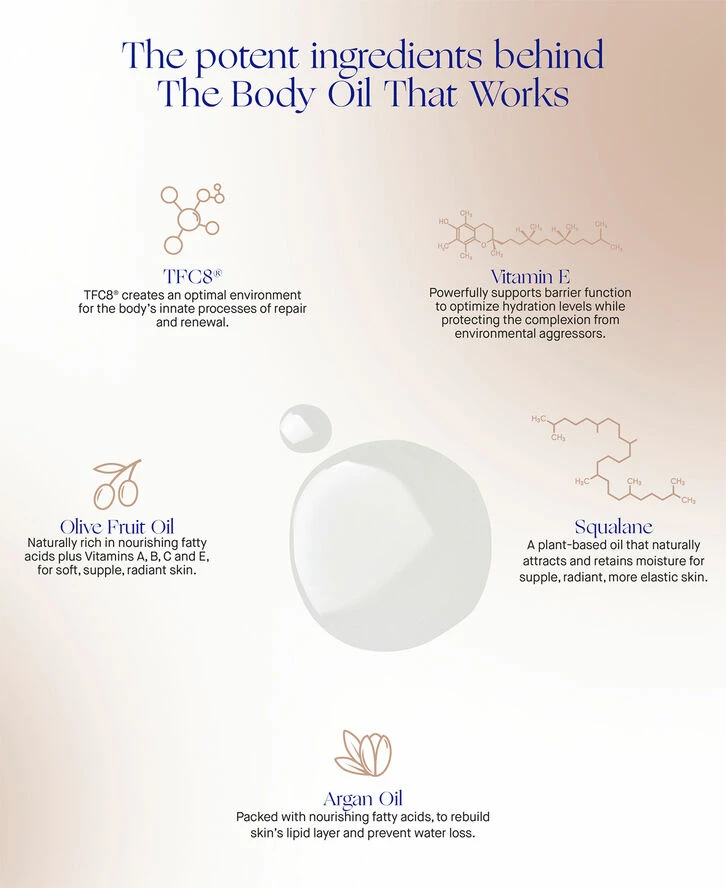 En højtpræsterende, intensivt nærende og fugtgivende kropsolie, der giver tydelige resultater. Absorberes hurtigt af huden, og klæber ikke.