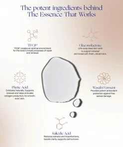 The Essence består af en banebrydende 3-i-1 formel som kombinerer egenskaberne hos en mild eksfoliering, en rensende toner og en opfriskende, fugtivende essens. Anvendes dagligt efter rens.