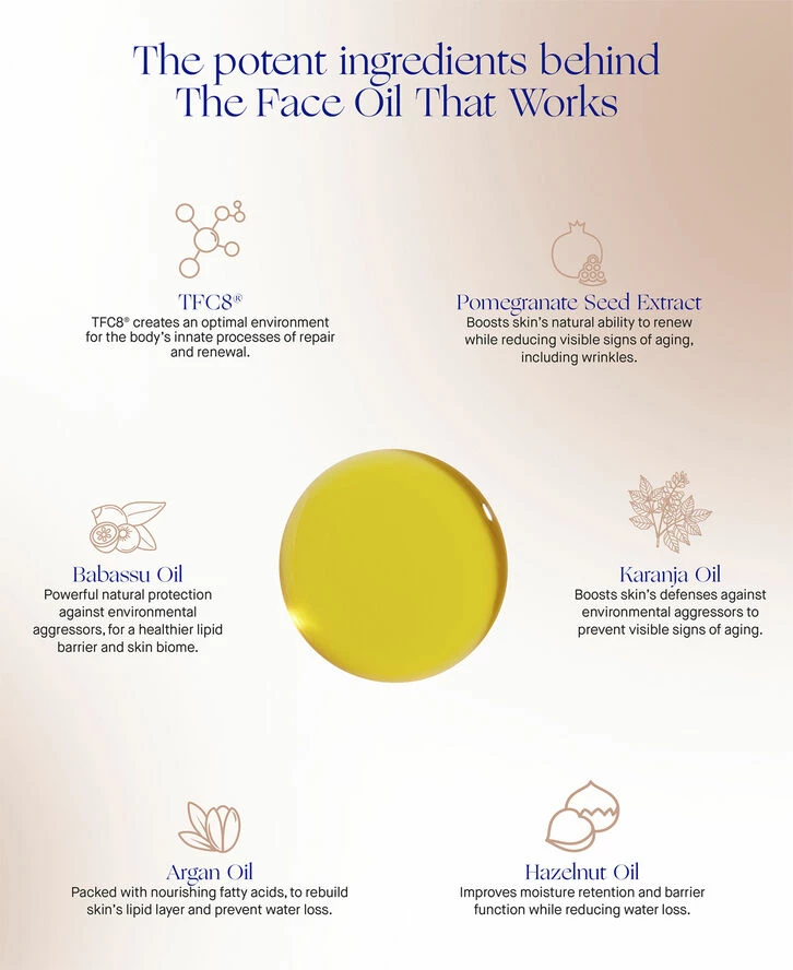 En balancerende, fugtgivende og nærende olie, der hurtigt trænger ind i huden og hjælper med at beskytte og give langvarig glød. Indeholder TFC8®. Passer alle hudtyper.