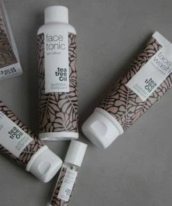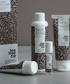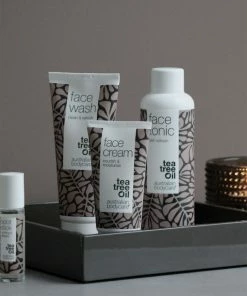 Ansigtspakken med 4 produkter til daglig rens og pleje af huden indeholder ansigtsrens, skin tonic, ansigtscreme og bumsepen, der ved hjælp af bakteriemodvirkende Tea Tree Oil modvirker uren og fedtet hud i ansigtet. Face Wash fjerner nænsomt makeuprester, overskydende talg og andet snavs fra huden. Face Tonic fungerer som en daglig dybderens af hudens porer, så hudorme og bumser effektivt modvirkes. Face Cream bruges som dagligt fugtgiver og tilfører næring og pleje til huden efter rens af ansigtet. Spot Stick er din førstehjælp til bumser og hudorme og skal påføres direkte på urenheden. Produkterne i ansigtspakken er dermatologisk testede og kan bruges af alle hudtyper. Produkterne er især effektive til en fedtet hud med bumser og hudorme, men kan også med fordel bruges til en tør eller almindelig hud for at forebygge bakterier og bumser.