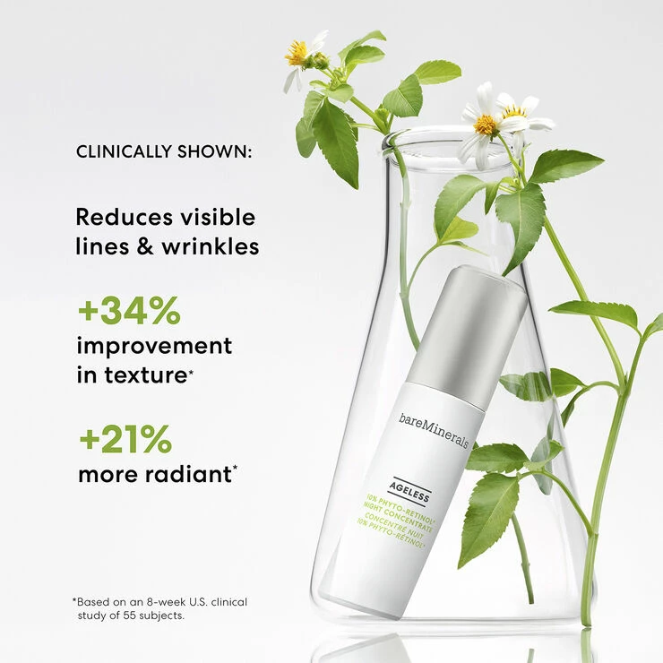 Et effektivt natkoncentrat med 10% Phyto-Retinol, der arbejder i løbet af natten for synligt at reducere fine linjer og rynker, samt udjævne hudtonen på kun 1 uge. Phyto-Retinol er et naturligt plantebaseret alternativ til retinol, der leverer de samme anti-aging fordele som retinol, men uden at forårsage rødme, tørhed eller følsomhed. Hyaluronsyre og proteinpeptider giver intens hydrering og fasthed til huden – for en sund, ungdommelig hud. Produktet er skabt til alle aldre, hudtyper og hudtoner. Ren, sund formel: