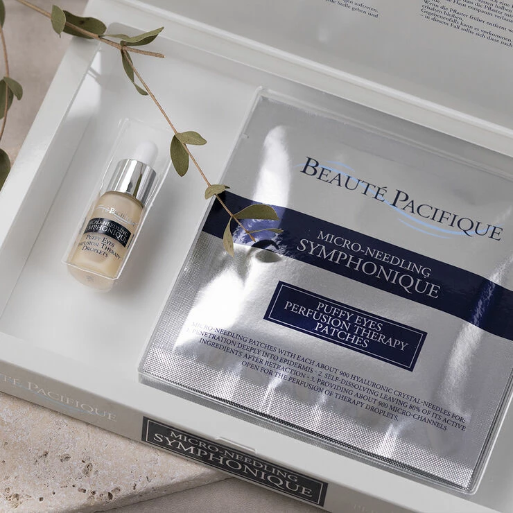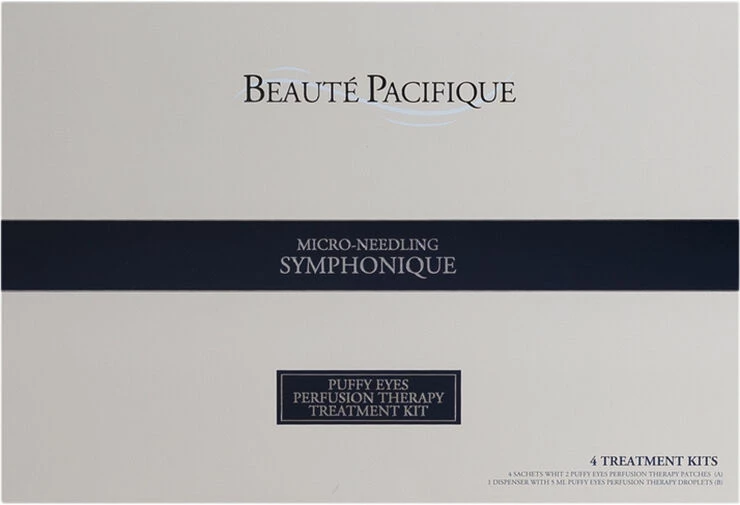 Symphonique Micro-Needling Perfusion Therapy Treatment Kit indeholder 2 produkter: (A) Puffy Eyes Perfusion Therapy Patches og (B) Puffy Eyes Perfusion Therapy Droplets der tilsammen opstrammer, udglatter og fugter huden omkring øjnene. Endvidere reduceres mørke rande og poser under øjnene, samtidigt med at forekomsten af fine linjer mindskes.