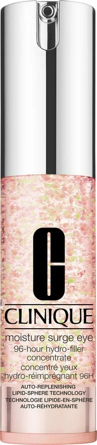 Moisture Surge™ Eye 96H Hydro-Filler Concentrate Er En ultralet, plejende og intens fugtgivende vand-gel, der hjælper huden omkring øjnene med at gendanne fugt og udglatte rynker i 96 timer. Genopfylder, strammer og opfrisker huden øjeblikkeligt. Fugter det sarte øjenområde i 96 timer ved hjælp af Auto-Replenishing Lipid-Sphere Technology Anvendelse: Brug en mængde på størrelse med en ært. Massér den ind i øjenomgivelserne. Brug den alene, under makeup eller som en 3-minutters øjenmaske. Benefits: Fugter. Allergi testet. 100% parfumefri. Testet af øjenlæger. Testet af hudlæger. Tilstopper ikke porerne. Velegnet til kontaktlinsebrugere. Tips: “Ligeledes andre Moisture Surge produkter er denne øjencreme en multitasker. Fantastisk til brug alene eller under makeup. Den forbereder huden til makeup ved at udglatte øjenomgivelsen ved brug af fugt, som forebygger at makeuppen lægger sig i de fine linjer. Desuden er den fantastisk som en 3-minutters øjenmaske, perfekt til flyet, før en bytur, eller når dine øjne har brug for et fugtboost.