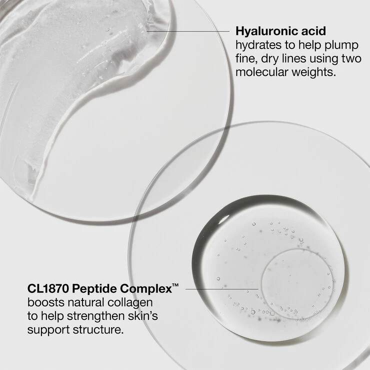 · Hyaluronsyre: Vores formel bruger hyaluronsyre med to molekylærvægte. Denne intense fugtighedsbevarende ingrediens hjælper med at fylde din hud med fugt og holde på den. Hjælper med at genoprette smidigheden og synligt udglatte fine, tørre linjer.