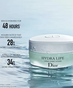 Denne fugtgivende og lækre Dior-creme kombinerer naturlige og effektive ingredienser, blandt andet hyaluronsyre og katost fra Diors haver. Dior Hydra Life Intense Sorbet Creme består af 93 %* naturlige ingredienser. Dens cremede konsistens føles let på huden og tilfrer huden fugt og intens næring i 48 timer.** Med Intense Sorbet Creme fra Dior Hydra Life reduceres følelsen af ubehag, uden af cremen virker hverken fedtet eller klistret på huden.