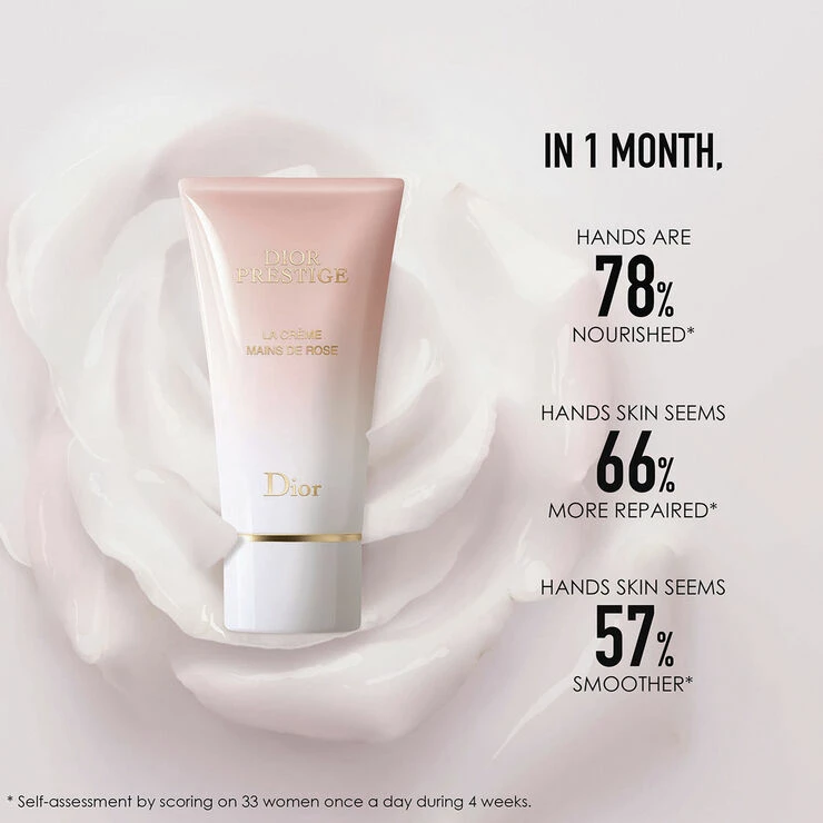 Fantastiske mikronrende og genopbyggende Dior Prestige La Creme Mains de Rose er det første Dior håndplejeprodukt, der er sammensat af 94 %* naturlige ingredienser, som kombinerer styrken i Rose de Granville mikronringsstoffer med rosenfiberekstrakt, rosenvoks og rosenolie med den mest komplette** aldershæmmende virkning. Det hjælper med at nære, udglatte og lysne hænderne. * Mængder beregnet på grundlag af ISO 16128-1og ISO 16128-2 standard og leverandørdata. Procentdelen af vand inkluderet. **Hos Dior.