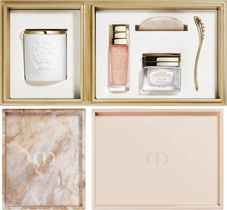 Fra en dyrebar beholder bliver etuiet et ekstraordinært stativ, for at forbedre de Dior-kreationer, det indeholder. Dior Prestige-udvalget er harmonisk arrangeret i kassen og inkluderer: