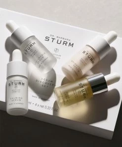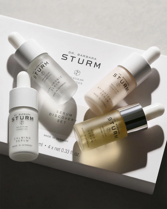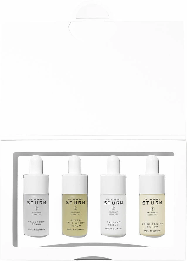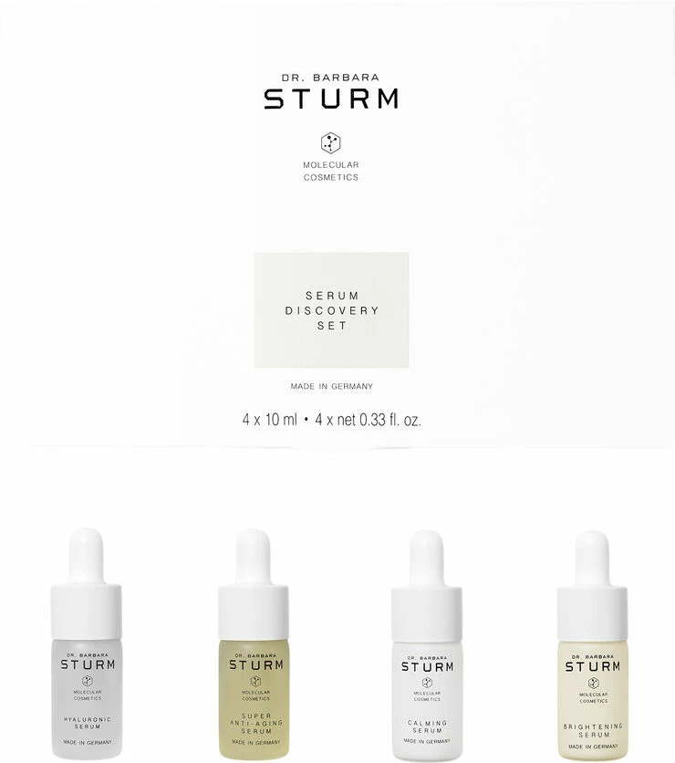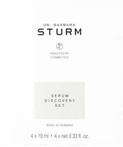 Dr. Barbara Sturms SERUM DISCOVERY SET er et kraftfuldt udvalg af 4 x 10 ml serummer der leverer øjeblikkelig fugt og stærke antioxidanter for at beskytte og reparere med øjeblikkeligt synlige opstrammende effekter. Perfekt som en introduktion til Dr Barbara Sturms produkter eller som et rejsesæt, påfør et serum for at forynge, berolige og lindre og tilføj en mere jævn glød til din hud. SERUM DISCOVERY SET indeholder SUPER ANTI-AGING SERUM, fyldt med aktive antioxidanter og beroligende ingredienser der nærer din hud mens synlige tegn på inflammation reduceres. HYALURONIC SERUM giver intensiv hydrering og giver en øjeblikkelig effekt. Ved regelmæssig brug er serummet yderst effektiv til at forebygge dannelse af rynker der forårsages af dehydrering. CALMING SERUM lindrer, reducerer synligheden af rødme og beroliger huden. Den nye BRIGHTENING SERUM reducerer synlige tegn på ujævn pigmentering, forfiner hudens tone og tekstur og efterlader huden strålende og fejlfri.