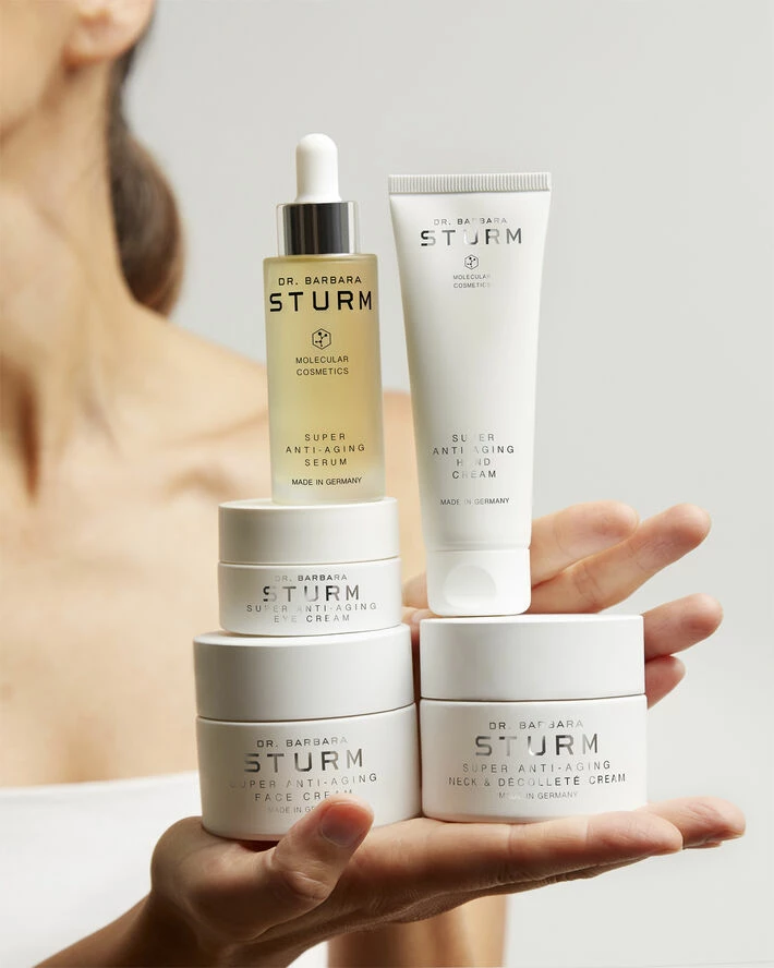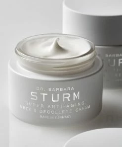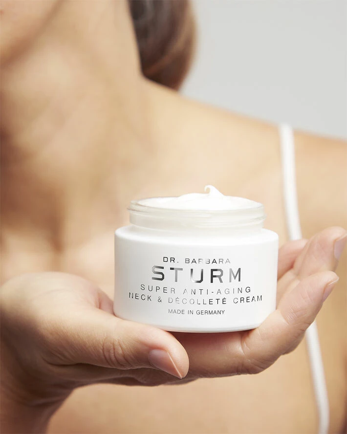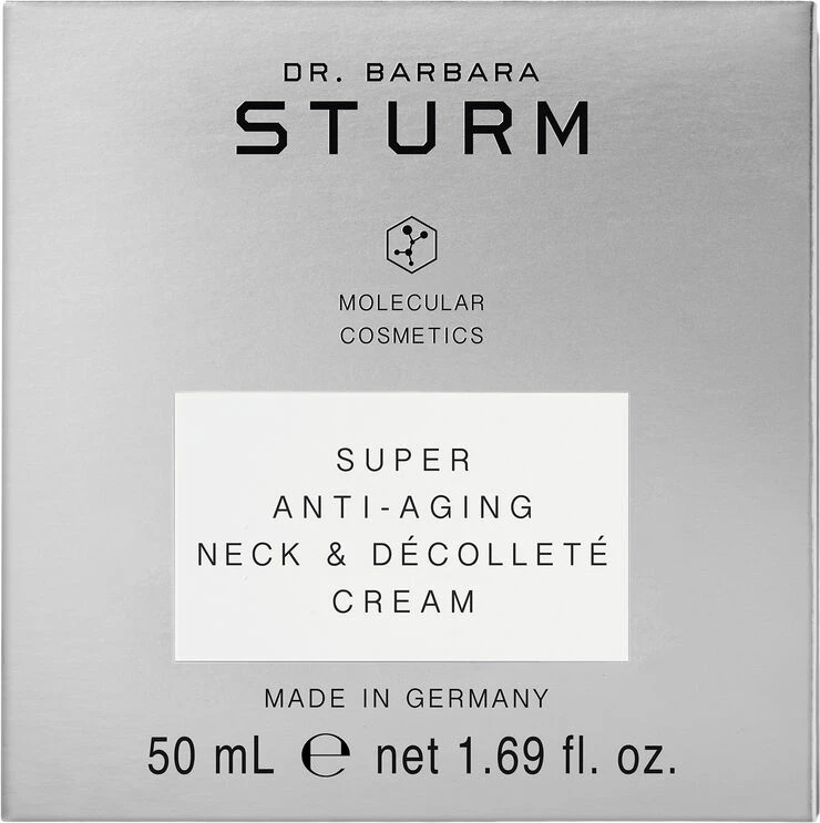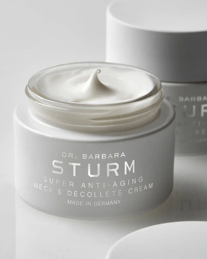 Hals og décolleté er områder vi har tendens til at glemme at pleje, men netop disse områder ældes hurtigere end resten af ansigtet og kroppen. Her indeholder huden færre talgkirtler og har derfor en tendens til at være tyndere, hvilket betyder, at den er mere tilbøjelig til dehydrering, rynker, fine linjer, tab af elasticitet, synlige oliekirtler, telangiektasier (små, udvidede blodkar), hypo- og hyperpigmentering. Dr. Barbara Sturms SUPER ANTI-AGING NECK & DÉCOLLETÉ CREAM er den nyeste produkt udvidelse til den bedst sælgende SUPER ANTI-AGING COLLECTION. Produktet indeholder en høj koncentration af potente ingredienser, der retter sig mod de specifikke behov huden har på halsen og décolleté. Ceramider og nærende lipider fra Sheasmør, Marula Olie og Mango Frø Olie understøtter hudens egen lipid barriere, og super ingrediensen Portulak indeholder fantastiske antioxidanter. Figenkaktus og hyaluronsyre tilbyder intensiv fugt og hududglatning, mens ekstrakt fra Shiitake-svampen opstrammer huden. Til sidst afsluttes ingredienslisten med indhold af Kombucha- og Marguerit-ekstrakter, som balancerer hudtonen og hjælper med at mindske forekomsten af mørke pletter. Ved regelmæssig brug efterlader SUPER ANTI-AGING NECK & DÉCOLLETÉ CREAM huden både ensartet, tonet, glat og ungdommelig.