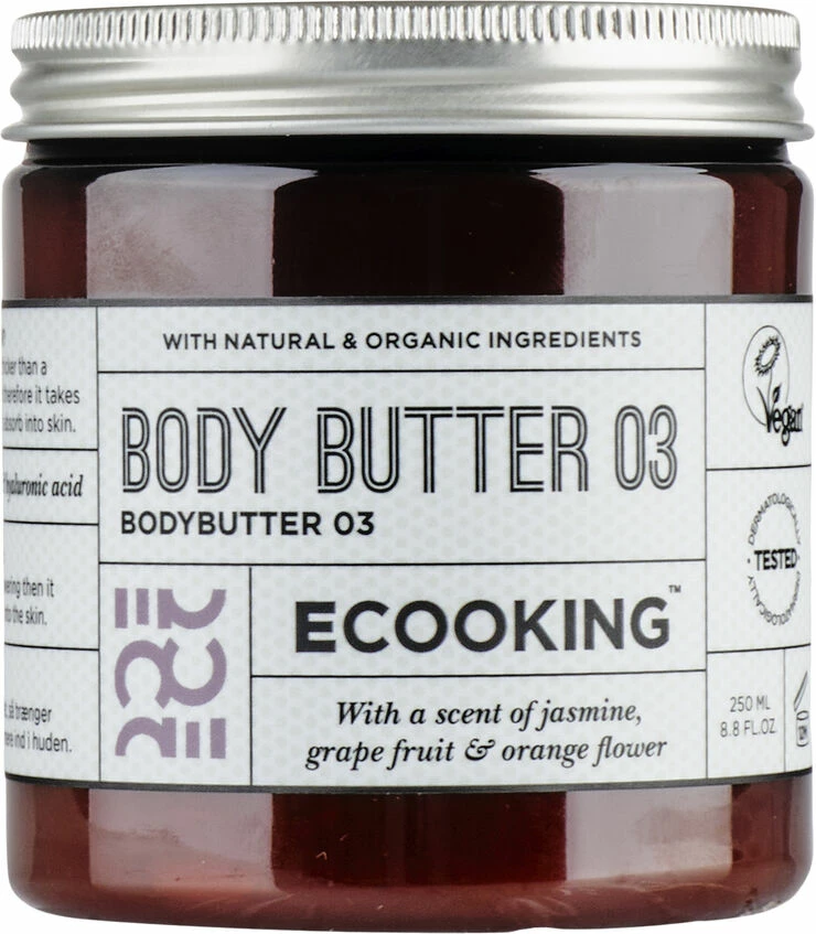 Bodybutter 03 er en fed, vegansk creme fyldt med fugtgivende olier og blødgørende kakaosmør. Selvom cremen har en fed konsistens, fedter den ikke. Cremen består bl.a. af niacinamid, E-vitamin og hyaluronsyre, som er med til at give din hud fugt og en ensartet tone. Desuden stimulerer niacinamid huden, hvilket øger hudens smidighed og elasticitet og gør huden mere fast. Bodybutter 03 har en skøn duft af jasmin, grape og appelsinblomst.
