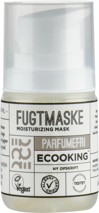 Fugtmasken er en af maskefavoritterne hos Ecooking, og du kan selvfølgelig også få den i en allergivenlig udgave uden duft. Fugtmasken er ganske enkelt et ordentligt fugtboost på flaske. Den nye opskrift indeholder to slags hyaluronsyre: En med lav molekylvægt, der trænger hurtigt ind i huden og binder fugt, og en med høj molekylvægt, som lægger sig på hudens overflade, hvor den blødgør huden. Derudover har vi tilføjet naturlig græskarkerneekstrakt, der øger hudens kollagenproduktion og styrker huden samt økologisk Aloe vera til at køle og beskytte din hud. Så med Fugtmaske er din hud i godt og plejende selskab. Fugtmaske Parfumefri er en mild og allergivenlig maske, der går godt i spænd med alle hudtyper.