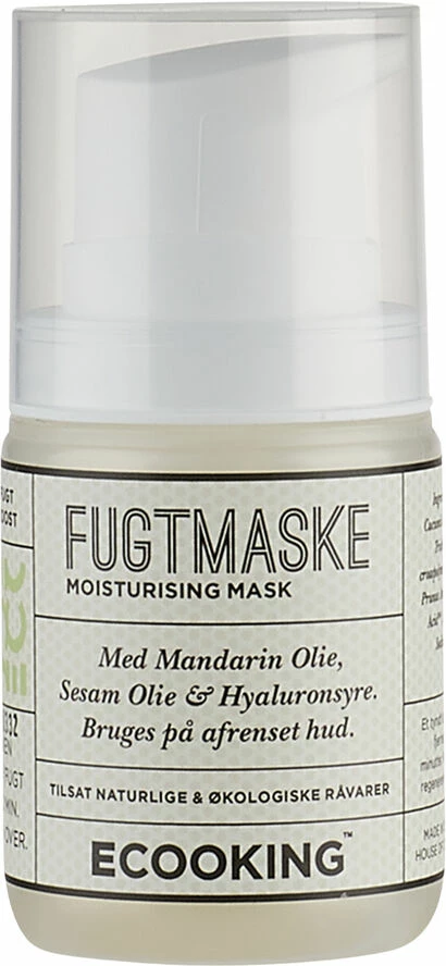 Fugtgivende maske med Hyaluronsyre, Sesam-, Mandarin- og Mandel Olie, som efterlader huden sund og silkeblød. Fugtmasken indeholder egenskaber, der gør, at huden bevarer sin fugtbalance samtidig med den har en beskyttende og genopbyggende anti-age effekt. Indeholder bl.a. argurkevand, Aloe Vera, Mandarin Olie, Mandel Olie, sesam Olie, økologiksk Glycerin og Naturlig Hyaluronsyre. 100% vegansk. Dermatologisk testet. Anvendelse: Rens din hud med din yndlingsrens fra Ecooking. Påfør Fugtmasken i et tyndt lag i ansigtet og på halsen. Lad virke i 10 minutter eller natten over. Skyl masken af med rindende vand. Påfør derefter dit yndlingsserum efterfulgt af ansigtscreme. TIP: For optimal udnyttelse, kan du med fordel anvende Ecooking Peel Maske, inden du påfører Fugtmasken. Peel Masken eksfolierer de døde hudceller og sætter gang i celleproduktionen. Fugtmasken tilfører fugt og reparerer huden og giver den glød.