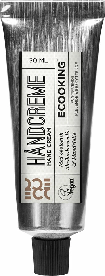 Beskyttende, fugtgivende og plejende håndcreme. Ecooking håndcreme indeholder bl.a. de bedste dyrkede olier og planteekstrakter. Denne plejende og helende håndcreme beskytter hænderne samtidig med den fugter og reparerer. Håndcremen kan bruges af hele familien og passer til alle hudtyper. Indeholder bl.a. Mandel Olie og Abrikoskerne Olie. 100% vegansk. Dermatologisk testet. Håndcremen findes i 2 størrelser. 30ml og 75ml.
