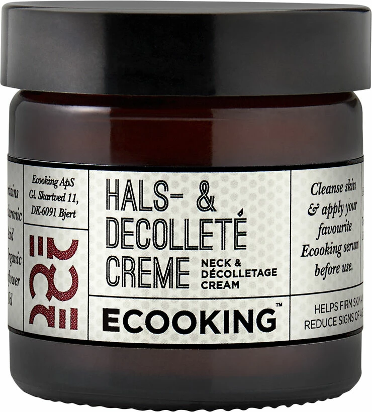 Creme med anti-age ingredienser, der er med til at opstramme, udsætte alderstegn og afhjælpe huden mod hyperpigmentering. Ecooking Hals- & Decolleté creme er specielt udviklet til brug på hals og decolleté, med det formå at stramme op og forebygge alderstegn. Og som en ekstra bonus undertrykker og beskytter den mod melamin, som er det stof, der er årsagen til pigmentpletter. Indeholder en række effektive ingredienser bl.a. Hyadisine, der er med til at regenerere og beskytte ved at bevare fugt og vand i huden. Cellulobeads er en ingrediens, der bekæmper rynker og fine linjer og giver her-og-nu effekt. Samtidig efterlades huden blød og gennemfugtet. Niacinamide, afledt af B3-vitaminet, der undertrykker Melanin mod at nå overfladen af huden og beskytter samtidig huden mod yderligere UV-skade. 100% Vegansk. Dermatologisk testet. Anvendelse: Fordel cremen på hals og decolleté. Anvendes om morgen og evt. aften. TIP: Området ved hals og decolleté er et af de steder på kroppen, hvor huden ældes hurtigst. Det er derfor vigtigt, at man beskytter og forebygger huden med en god creme, der modvirker alderstegn