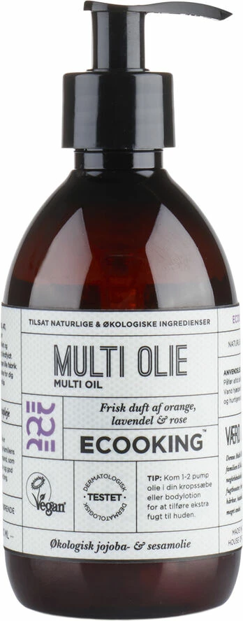 Multi Olie er et multiprodukt, som består af en blanding af unikke, multifunktionelle, økologiske olier og essentielle duftudtræk af orange og lavendel.