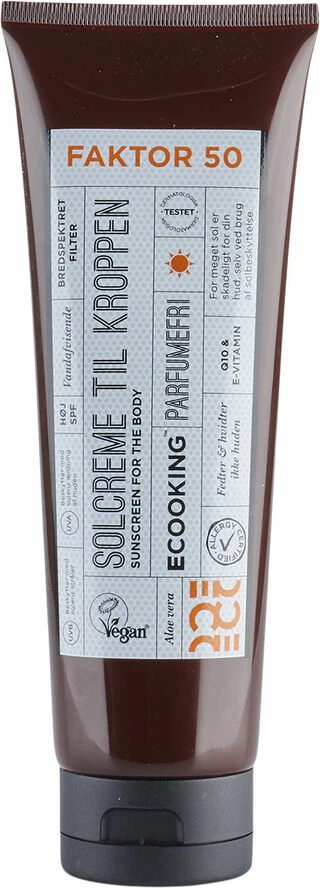 Solcreme Til Kroppen SPF 50 beskytter din hud mod UVA- og UVB-stråler, samtidig med at den plejer, nærer og fugter huden. Indeholder tre bredspektrede, kemiske solfiltre, der beskytter bredt mod både UVA- og UVB-stråler. Kemiske filtre trænger ind i det øverste hudlag, hvor de absorberer UV-stråler og forhindrer således at strålingen når ind i huden og skader. Samt et fysisk filter, zink oxid, der beskytter ved at lægge en tynd hinde på huden, som reflekterer solens stråler. Derudover er Solcreme Til Kroppen beriget med Q10 – fremmer hudstrukturen og giver en hud som føles fastere og blødere. Naturligt E-vitamin – en stærk antioxidant, der beskytter mod frie radikaler og giver fugt. Naturlig squalane – holder på fugten i huden og forbedrer hudelasticiteten. Økologisk Aloe vera – hjælper med at hydrere og styrke huden. Ecooking Solcreme Til Kroppen er vandafvisende og nem at smøre ind. Den trænger let ind i huden uden at fedte eller hvidte. Kan anvendes af alle hudtyper. 100% vegansk. Fri for parfume. AllergyCertified. Dermatologisk testet. Anvendelse: Brug solbeskyttelse, hver gang du opholder dig i solen. Solcremen skal smøres godt ind 10-15 minutter, før du går ud i solen. Når du har badet i længere tid, skal du huske at smøre dig ind igen for ikke at blive solskoldet. Smør huden ind flere gange dagligt, da solcremens effekt falder i løbet af dagen. Solcreme Til Kroppen findes også med SPF 30