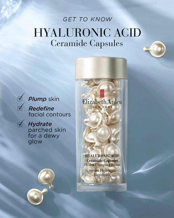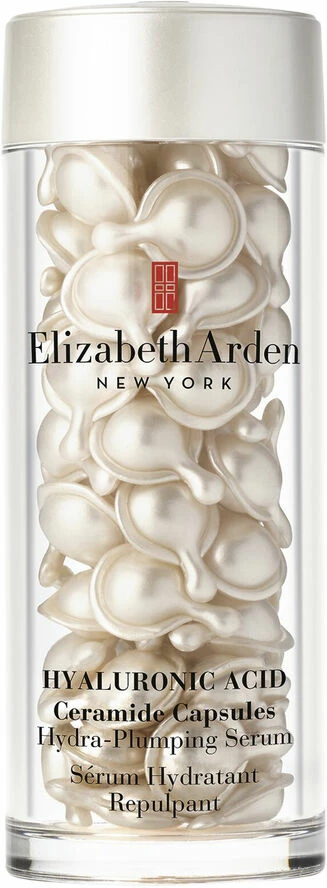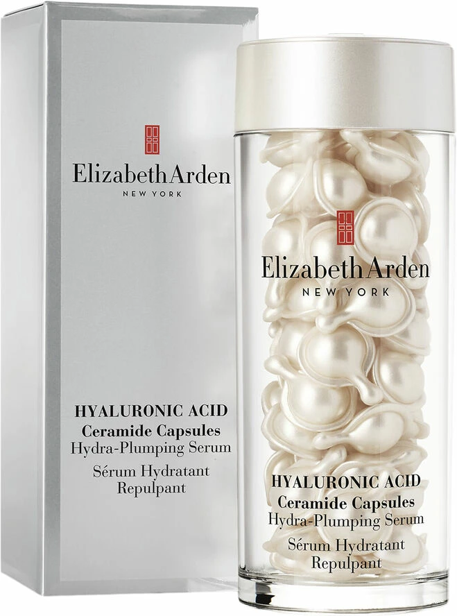 Elizabeth Arden Hyaluronic Acid Ceramide Capsules er et serum, der består af HYALURONSYRE + CERAMIDER. Tilsammen styrker de huden og genskaber hudens elasticitet. Huden fyldes ud indefra, så ansigtskonturerne står mere skarpt og defineret. Dette silkeagtige, letvægtsserum har egenskaben Double-Lock Hydration. Hyaluronsyre trækker fugt ind, mens ceramider låser fugten inde, så huden holdes fugtet længere og fremstår mere spændstig. Serummet er emballeret som enkeltdosiskapsel. Du får derfor en præcis doseret mængde serum i én kapsel. Serummet er samtidig beskytter mod lys og luft og derfor helt rent og potent ved brug. Kapslen er biologisk nedbrydelig. Ikke tilsat duft. Fordele: Udglatter: Huden får sin volumen og fyldighed tilbage Opstrammer: Genskaber ansigtskonturerne Intensiv fugt: Giver varig fugt og dugfrisk glød til udtørret hud Nøgleingredienser: Hyaluronsyre: Zero H2O Technology giver en effektiv levering af hyaluronsyre ind til hudens overflade og sikrer optimal hydrering og gendannelse af vital fyldig fugt. Ceramider: Hudfornyende ceramider, der styrker hudens barriere. Gør huden mere fast, glat og forebygger fugttab. Ingefær-ekstrakt: Kraftfuld antioxidant, der støtter hudens naturlige kollagen for at give styrke og fasthed til huden.