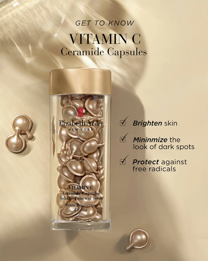 Ceramider og C-Vitamin fusioneret i én kapsel. Indeholder fedtopløseligt C-Vitamin, der bekæmper frie radikaler og samtidig virker lysnende på huden. Ceramideindholdet styrker huden og dens fugtbarriere og med til at give en sund hud i balance. Et serum, der gør huden mere levende, samtidig med at det beskytter mod for tidlig ældning. Indkapslet i Elizabeth Ardens biologisk nedbrydelige kapsel, der giver et friskt og effektivt serum og sikrer en præcis dosis. Til alle aldre.