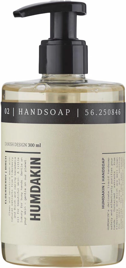 HAND SOAP 02 – Birch and elderberryA gentle hand soap with natural extracts of elderberry and birch, which leaves your hands moisturized with a pleasant fresh scent. A little luxury for busy hands. Gentle on your skin – gentle on our planet.This delicate liquid hand soap contains natural extracts of elderberry and birch. Elderberry is known for its caring and anti-ageing properties, while birch contains anti-irritant and antiseptic properties and is known for its soothing and curative effect. This hand soap is enriched with macadamia oil and panthenol, which are especially helpful for irritated and dry skin. The HUMDAKIN hand soap with elderberry and birch helps soften and moisturize your hands in every wash.