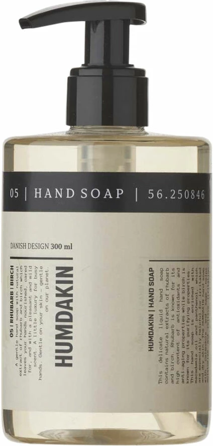 05 HAND SOAP Rhubarb and Birch 300 ml. Clean and sensitive hand soap with natural extracts of Rhubarb and Birch and caring macadamia oil for beautiful skin. A little luxury for busy hands. This delicate liquid hand soap contains natural extracts of Rhubarb and Birch which is known for its anti-inflammatory and soothing properties. Dry your hands with Humdakin knitted kitchen towel and finish off with the 05 hand lotion for soft and moisturized hands. This hand soap is enriched with macadamia oil and panthenol, which are especially helpful for irritated and dry skin. The HUMDAKIN hand soap with rhubarb and birch helps soften and moisturize your hands in every wash and leaves your hands with a gentle fresh scent. HUMDAKINs liquid products are free of parabens, dyes, essential oils, chemical perfumes, endocrine disrupting substances and carcinogens. HUMDAKINs products contain allergy friendly perfume and only mild preservatives. HUMDAKINs liquid products are dermatologically testet. The packaging is made of reusable plastic.