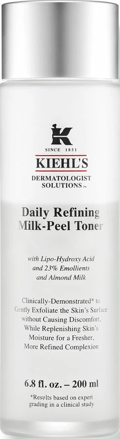 Kiehl’s Daily Refining Milk-Peel Toner Hvad den en Milk-Peel Toner Vores milk-peel toner kan brugs dagligt til at rense og ekfolierer huden. Denne dobbeltvirkende toner indeholder lipohydroxysyre og 23 % blødgørende stoffer som bl.a. mandelmælk, så den plejer huden mens den skånsomt eksfolierer og opløser urenheder. Hudens fugtighedsniveau genoprettes og huden efterlades men en ensartet tekstur og og en blød og behagelig fornemmelse. Velegnet til • Skånsom nok til daglig brug • Eksfoliere blidt uden ubehag* • Genopretter hudens fugtighedsniveau og efterlader huden med en behagelig fornemmelse • Udglatter og gør huden mere ensartet Kan bruges til alle hudtyper, også følsom hud *Resultater baseret på ekspertbedømmelse i en klinisk undersøgelse Vidste du det? Milk-Peels er ofte brugt til at forbedre hudens tekstur og udseendet især hos dem der kæmper med ujævnheder. Milk-Peels lave syreindhold opretholder hudens naturlige fugtbalance, mens den eksfolierer hudens barriere. Det lave indhold af syrer gør vores blide milk-peel toner velegnet til daglig brug. LIPOHYDROXYSYRE: Lipohydroxysyre er en form for salisylsyre, der eksfolierer huden, opløser urenheder og give en klarere udseendet. Lipohydroxysyre har en blidere ph-værdi end normalt, så den kan bruges dagligt – selv på følsom hud. 23 % FUGTGIVENDE INGREDIENSER inkl. MANDELMÆLK: Vores Milk Peel toner fugter og blødgør huden med 23 % fugtgivende ingredienser inklusiv mandelmælk.hvis nærende og beroligende egenskaber er med til at give huden fylde og efterlader den med en blød og behagelig fornemmelse.