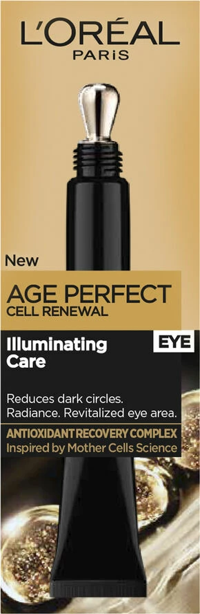L’Oréal Paris Age Perfect Cell Renewal Illuminating Eye Care er en glødgivende øjencreme til moden hud. Dens formel indeholder Antioxidant Recovery Complex som har evnen til at forbedre cellefornyelsen i epidermis (hudoverfladen), give glød og en hud som ser yngre ud. Antioxidant Recovery Complex består af en kombination af to kraftfulde ingredienser for at beskytte cellerne mod frie radikaler: neohesperidin, en bredspektret antioxidant udvundet fra bitterappelsin ved hjælp af grøn kemi, og E-vitamin, en essentiel antioxidant som findes naturligt i huden. På grund af ydre påvirkninger falder niveauet af E-vitamin i løbet af dagen. L’Oréal Paris Age Perfect Cell Renewal Illuminating Eye Care-øjencremes øjeblikkelige resultater og resultater på lang sigt: Øjeblikkeligt: Øjenområdet bliver fugtet og fastere. Dag for dag: Mørke rande og poser under øjnene er synligt reduceret. Øjenområdet fremstår revitaliseret, mere strålende og glattere.