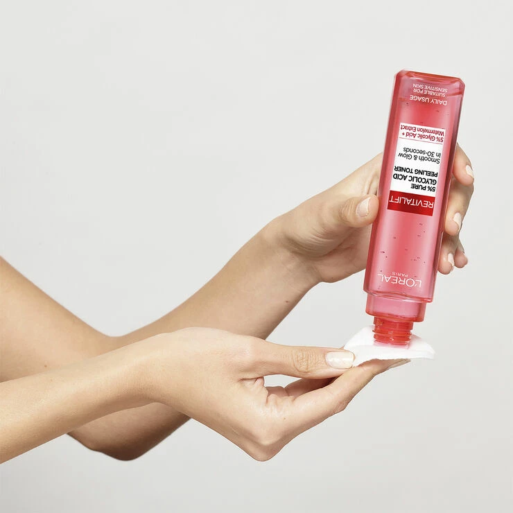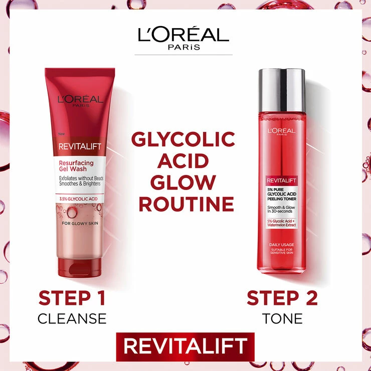L’Oréal Paris Revitalift Glycolic Peeling Toner er eksfolierende toner som gør huden glattere med mere glød på 30 sekunder. Formlen indeholder 5 % glycolsyre og ekstrakt fra vandmelon. Glycolsyre er den dermatologiske guldstandard inden for professionel peeling i en koncentret formel på 5% for optimal effektivitet og sikkerhed hver dag. L’Oréal Paris Revitalift Glycolic Peeling Toner giver synlige resultater: På 30 sekunder: Hudens kvalitet er forbedret. Huden fremstår glattere og mere strålende. På 4 uger: Hudens tekstur føles forfinet. Hudens ujævnheder er reduceret. På 8 uger: Mørke pletter er dæmpet.