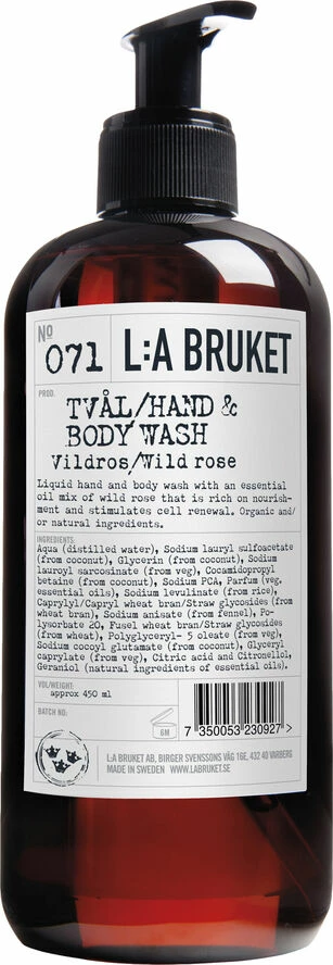 Lækker, økologisk flydende hånd- og kropsæbe med duft af Vildrose fra svenske L:A Bruket.100% økologiske eller naturlige ingredienser. Vildrose giver næring samt stimulerer huden. Desuden har den antibakterielle og anti inflammatoriske egenskaber. Sæben kommer i en flot 450 ml brun flaske med pumpe. L:A Bruket producerer alle deres lækre produkter i området omkring Varberg på den svenske vest kyste.