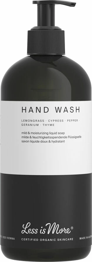 The Less is More flydende sæbe renser forsigtigt hænderne og har en fugtgivende effekt. Aloe vera juice indeholdt i sæbe nærer huden og har også en beroligende effekt. Naturlige enzymer styrker hudbarrieren og giver yderligere fugt. Den milde sæbe med sin forfriskende duft er velegnet til alle hudtyper, følsom hud og endda børn.