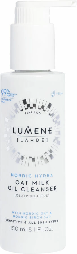 Lumene Nordic Hydra Oat Milk Oil Cleanser renser effektivt, men skånsomt ansigts- og øjenmakeup og efterlader huden helt ren, blød og fugtet. Den silkebløde og uparfumeret olie-vand-emulsion indeholder plejende nordisk havremælk og havreolie, præbiotisk nordisk havre xylitol og fugtgivende nordisk økologisk birkesaft. Den er især skånsomt mod hudens naturlige fugtbarriere og mikrobiom. Passer til alle hudtyper og er perfekt til tør, dehydreret og følsom hud. Også velegnet til øjenområdet. Rensen er uden parfume, 100% vegansk. Brug: Påfør på tørt ansigt med blide roterende bevægelser og skyl med vand.