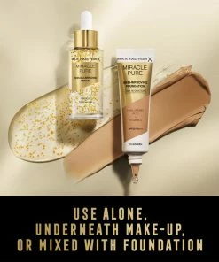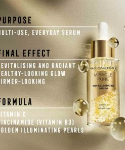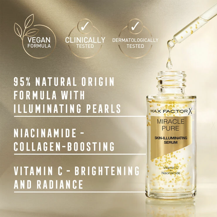 Giv din hud et dagligt boost af vitaminer, og få en øjeblikkelig sund glød med Max Factor Miracle Pure Skin-Illuminating Serum. Dette plejende og forskønnende serum indeholder små perler af gyldent pigment, der giver huden et friskt og klart look. Vegansk produkt med C-vitamin og niacinamid (B3). Klinisk dokumenteret effekt. Dette alsidige serum kan bæres alene, under makeup og kan også blandes med foundation, hvis huden har brug for et plejende boost og ekstra glød. Inspireret af naturen, forfinet af Max Factor.