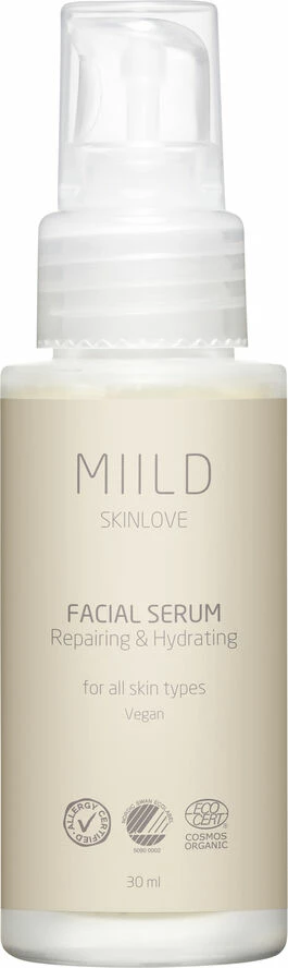 Facial Serum bevarer blødhed og smidighed i huden. Den udglatter og gør huden mere ensartet. Den er bl.a. sammensat af hyaluronsyre, agurkeekstrakt og mandelekstrakt.