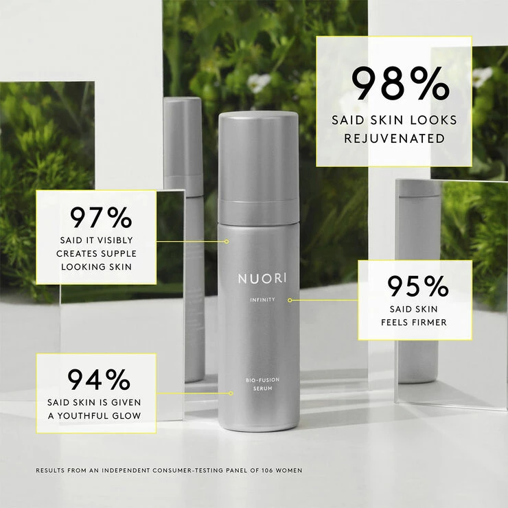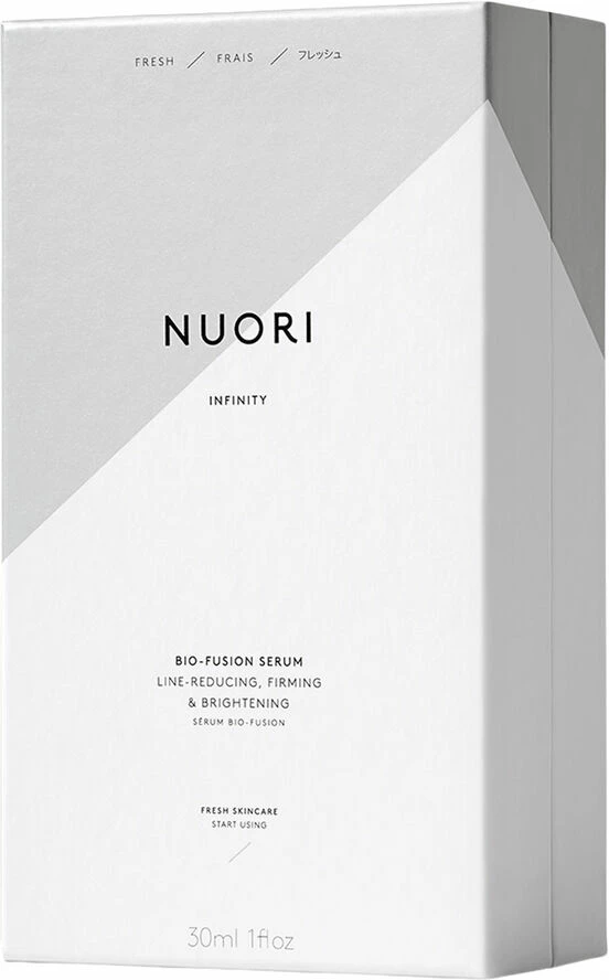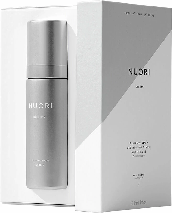 NUORI’s virksomme, men stadig lette Bio-Fusion Serum er formuleret med et naturligt alternativ til retinol, der adresserer universelle tegn på ældning af huden. Ved daglig brug reducerer denne serum forekomsten af fine linjer og rynker og giver huden et lysere og fastere udseende. Et bioekstrakt, udvundet af plantebaseret bakuchiol, er et naturligt alternativ til retinol, der tilbyder de samme hudfornyende resultater uden irritation eller lysfølsomhed. Den seneste generation af naturlig hyaluronsyre booster har synlig dermo-fyldende og fugtgivende effekt, og ceramider med høj biotilgængelighed understøtter fornyelse og genopbygning af hudens naturlige beskyttelsesbarriere. C-vitamin tilbyder antioxidantbeskyttelse og hjælper med en mere ensartet hudtone. INSTRUKTIONER: Påfør tre til fire pump på renset hud i ansigt, på hals og décolleté både morgen og aften. For optimale resultater vent 30 sekunder før din foretrukne INFINITY-creme påføres.