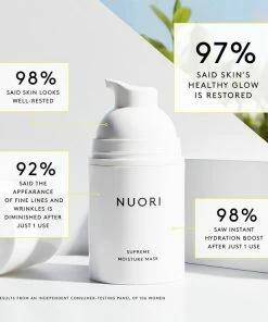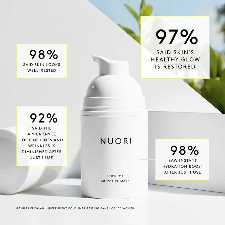NUORI’s lette men samtidig højtkoncentrerede fugtgivende maske er det ultimative produkt til dehydreret og livløs hud. Vindruevand og blomstervand fra økologisk damask rose kombineret med naturlig hyaluronsyre genopretter effektivt hudens fugtbalance, mens plantebaseret squalane og betaine styrker hudens barrierefunktion. Antiinflammatorisk kamilleblomst-ekstrakter bekæmper irritation og genopretter hudens smidighed. B3-vitamin forbedrer hudens fremtoning og elasticitet og forhindrer samtidig fugttab.