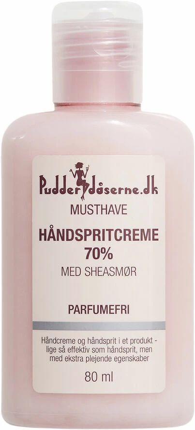 HÅNDSPRITCREME 70% er håndcreme og håndsprit i et produkt lige så effektiv som håndsprit, men med ekstra plejende egenskaber. Påfør rigeligt HÅNDSPRITCREME 70% og gnid cremen grundigt ind i begge hænder, rundt om og mellem fingrene, fingerspidser og negle, håndledende og håndryggene, hvorefter hænderne lufttørrer. 80 ml