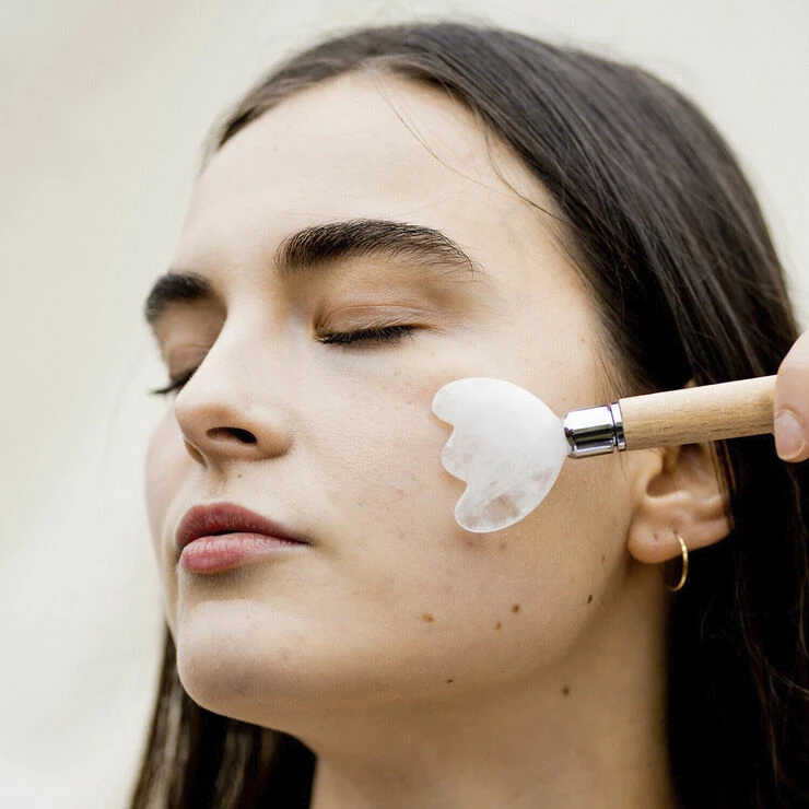 Gua sha-massagestenen hjælper med at tone ansigtet og udjævner fine linjer og rynker. Hvid kvarts har både en beroligende og energigivende virkning.