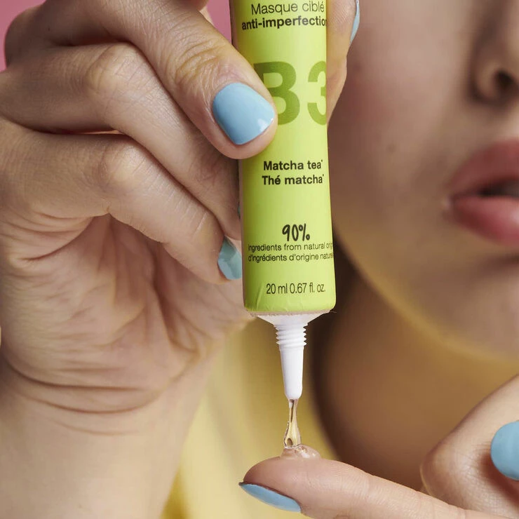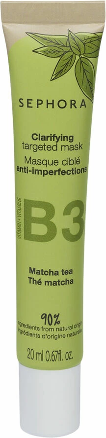 SEPHORA COLLECTION’s clarifying targeted mask indeholder 90% ingredienser af naturlig oprindelse og er beriget med matcha teplanteekstrakt og vitamin B3(2), for en hurtig og varig effekt på udseendet af urenheder.