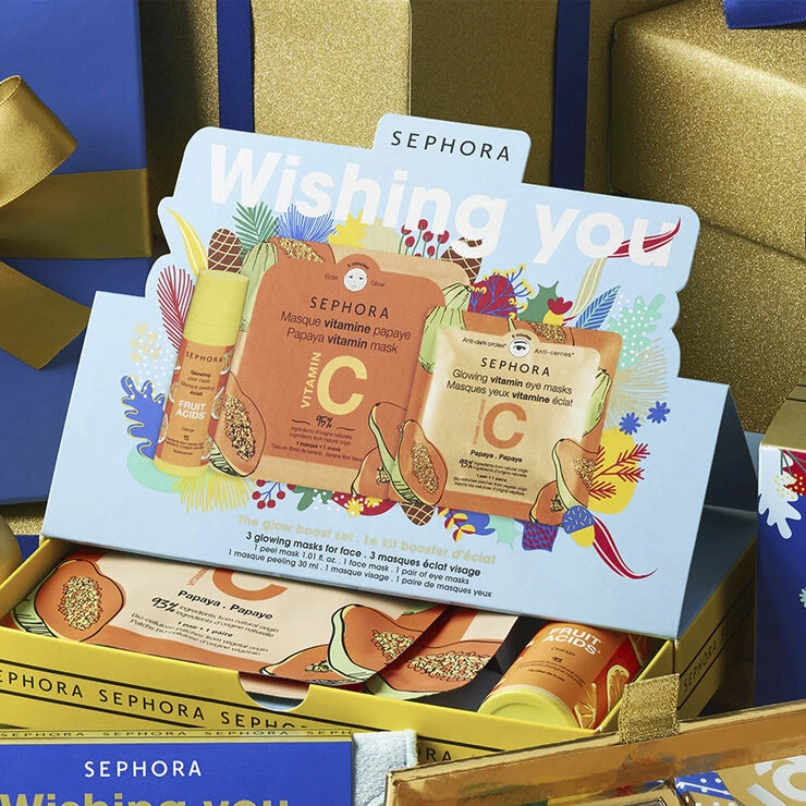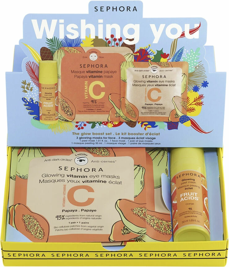 Indeni: frugtsyre glowing peel ansigtsmaske beriget med appelsinekstrakt, en vitamin C ansigtsmaske beriget med papayaekstrakt og et par glowing vitamin C Anti-mørke rande øjenmasker beriget med papayaekstrakt.