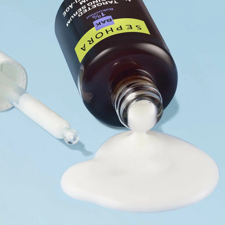 SEPHORA COLLECTION’s uparfumerede målrettede anti-aging serum, med 96% ingredienser af naturlig oprindelse og indeholdende 1% bakuchiol, og E-vitamin, bekæmper synligt tegn på aldring, virker på udseendet af fine linjer, rynker og opstrammer og udglatter huden, for et smukkere og yngre udseende ansigt. Dens lette og omsluttende konsistens fugter huden uden at give en klæbrig fornemmelse. Din daglige anti-aging-allierede!