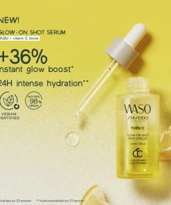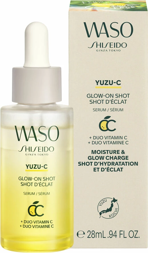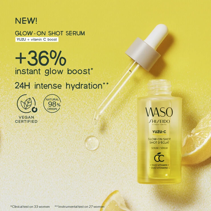 WASO Glow-On-Shot er et rent skud af fugt og glød! Formuleret med 98 % naturlige ingredienser* og beriget med Yuzu Citrus** og C-vitamin, giver den intens fugt og udstråling til din hud. Gør dig klar til at STRÅLE! *Ingredienser af naturlig oprindelse. Beregning baseret på ISO 16128 standard **in vitro HVORFOR ER DET SÅ SÆRLIGT? – Booster øjeblikkeligt huden med 36% efter første påføring*** – Giver 24 timers**** intens fugt, der fordobles inden for 8 timer**** efter påføring. – Din hudtone udjævnes ved regelmæssig brug. ***Klinisk test på 33 forsøgspersoner **** Instrumental test på 27 frivillige EN UNIK KOMBINATION AF STJERNE-INGREDIENSER YUZU japansk citrus: Yuzu-ekstrakt understøtter den naturlige produktion af hyaluronsyre*****, der gør det til en ultra-aktiv ingrediens, der giver intens fugt. Vitamin C Duo: En kombination af to komplementære former for C-vitamin, der effektivt retter sig mod pigmentforandringer relateret til overskydende melaninproduktion og udøver antioxidantvirkning***** for at bekæmpe faktorer, der bidrager til aldring. Japansk Shikuwasa ekstrakt: