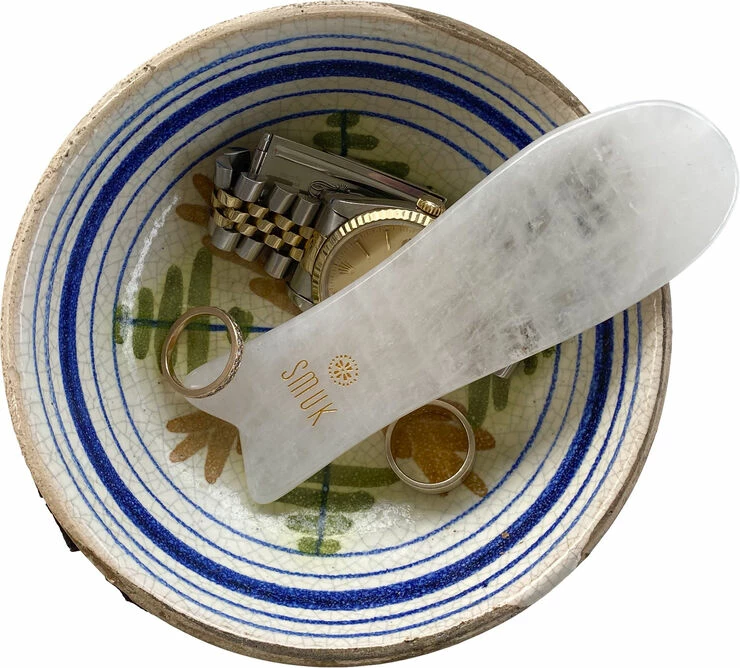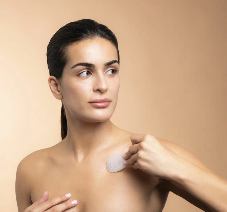 Gua Sha-stenen bruges til at massere ansigtet og kroppen, så blodcirkulationen øges betydeligt og bindevævet løsnes op og giver slip på spændte muskler. Bjergkrystallen kaldes “stenen over dem alle” og har en generelt healende effekt ved fysiske ubalancer. Når du styrker mikrocirkulationen i huden, styrker du cellevævet, og du vil efter et stykke tid fornemme og se den opstrammende effekt. Din hud får også mere glød af den øgede blodgennemstrømning. Bjergkrystal er en natursten og der kan derfor forekomme ujævnheder i farve og sten. Ujævnhederne kan ofte ses som små hakker/ridser, men må ikke kunne mærkes i huden som noget ubehageligt.