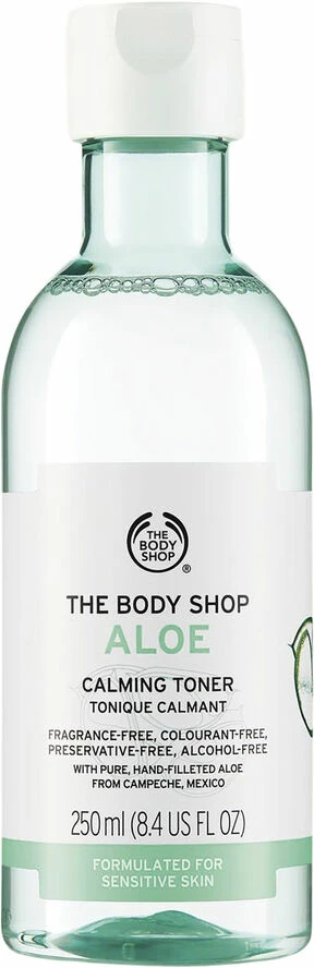 Lad en beroligende følelse strømme over dig med vores Aloe Calming Toner. Det er en forfriskende formulering, der holder huden i balance. En lille og blid efternøler. Skal man tone eller ikke-tone? Det er vist noget de fleste spørger sig selv. Men hvis du har tør og følsom hud, er en aloe vera toner et absolut must. Hvorfor? Jo, den er ikke bare en fryd for din følsomme sjæl, den fjerner også alt det knas, der trods alt stadig findes i huden efter en rens: snavs, makeup og de møgirriterende døde hudceller, der får huden til at se mere træt ud end hvad godt er. Nu fjerner tonere ikke længere alt det gode, der trods alt stadig findes i huden. Blot et opfriskende strøg med vores toner, der er beriget med aloe vera, vil få dit ansigt til at føles velplejet og fugtet, hvilket lader din smukke hud skinne igennem. Aloe Calming Toner fra The Body Shop er beriget med Community Fair Trade aloe vera fra Campeche i Mexico. Den ser måske lidt hårdfør ud med sit stikkende udseende, men indeni er aloe vera det blødeste af det bløde. Derfor er den perfekt til at pleje tør og følsom hud. Sikke en lettelse! Særligt formuleret til at pleje og opfriske tør og følsom hud Hjælper huden med at føles fugtet, blødere og mere smidig Beriget med Community Fair Trade aloe vera fra Campeche i Mexico