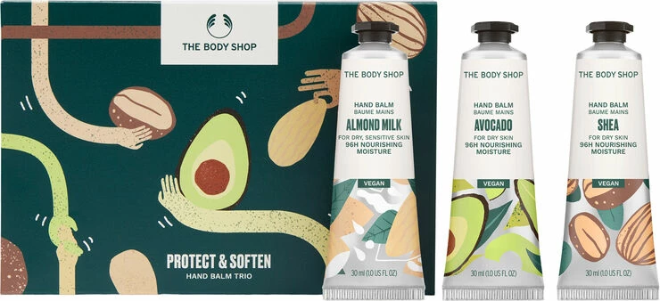 Giv silkebløde fingre og hænder i gave med vores Protect & Soften Hand Balm Trio. De er beriget med sheasmør og mandelmælk og tilfører hænderne masser af fugt. Og denne gave ikke bare elsker alle smukke hænder, den støtter samtidig vores Community Fair Trade partnere, som har hjulpet os med at fremstille den. Vores nærende Hand Creams er beriget med Community Fair Trade sheasmør fra Ghana. Vores Community Fair Trade-samarbejde hjælper 600 kvinder i 11 landsbyer med at opnå økonomisk stabilitet. Vi betaler selvfølgelig en fair pris for at støtte lokale udviklingsprojekter, samt en premium oveni, som 49.000 mennesker nyder godt af i form af lægehjælp og uddannelsesprojekter. Indtil videre er seks skoler og et sundhedscenter blevet finansieret af disse investeringer. Læs mere om, hvordan vi støtter lokalsamfund og kæmper for en mere retfærdig og smukkere verden. Almond Milk Hand Balm 30ml Avocado Hand Balm 30ml Shea Hand Balm 30ml