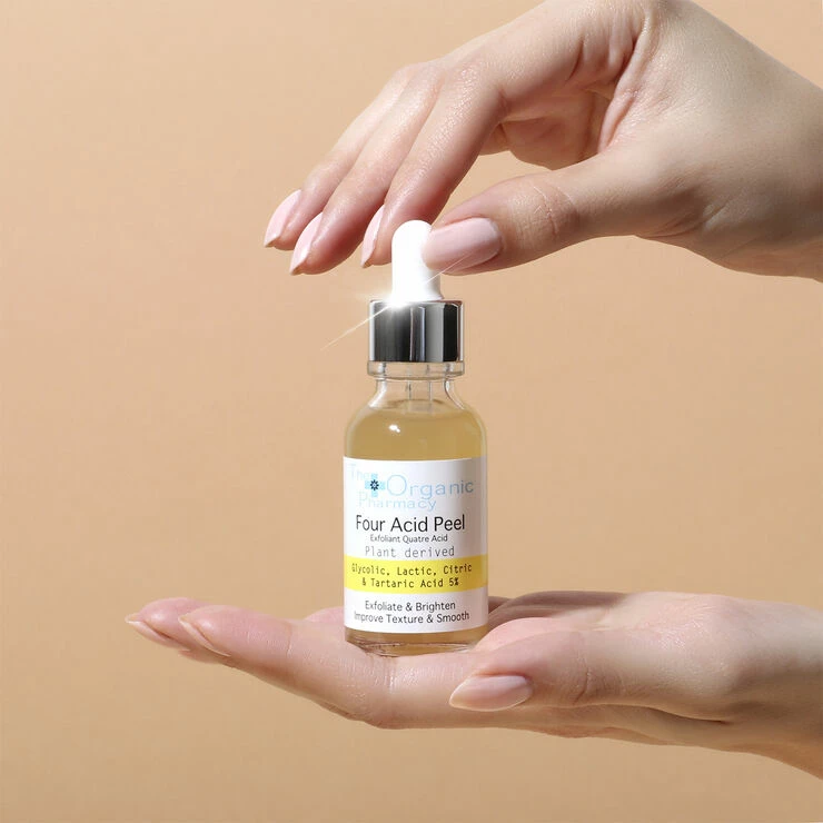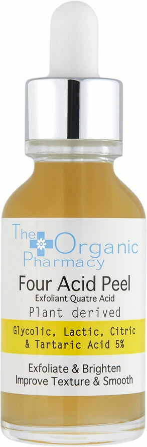 Four Acid Peel er en kraftfuld bestseller serum med 50% naturlige alfa hydroxylsyrer (AHA) fra passionfrugt, citron, vindrue og ananas (der giver glycolsyre, mælkesyre, citronsyre og vinsyre), eksfolierer dette udstrålings fremmende serum nænsomt og hjælper med at bekæmpe synligheden af pigmentforandringer, forbedre hudens tekstur og reducere synligheden af fine linjer, hvilket resulterer i en lysere, glattere, og mere sundt glødende hud. Blid nok til alle hudtyper, især mat og trist hud. Velegnet til veganere.