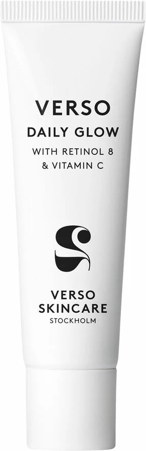 Verso Daily Glow indeholder en blanding af kraftfulde ingredienser: Det stabiliserede A-vitamin-kompleks, Retinol 8, revitaliserer huden, mens Vitamin B3 (Niacinamid) virker naturligt beskyttende og genskaber en ungdommelig fasthed i huden. C-vitamin reducerer vandtab og sø:rger for at bevare fugten i huden, så: den ser frisk og strå:lende ud. Hydrofil Hyaluronsyre forbedrer hudens elasticitet og gø:r den mere fyldig og fast.